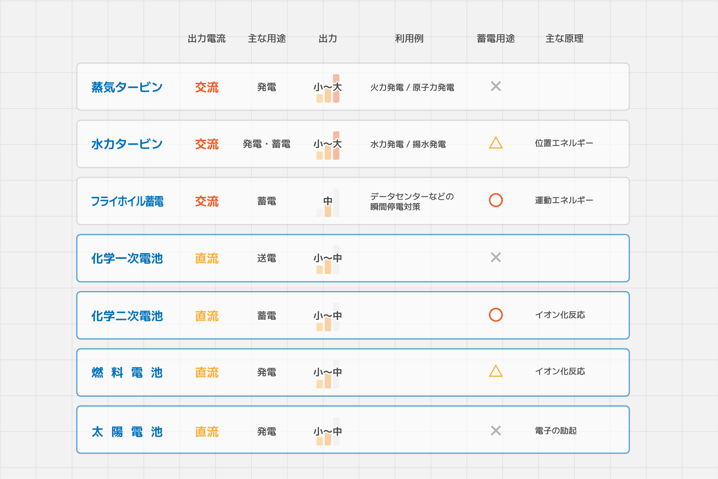 また、「水素燃料電池」は、その名称から水素と酸素の混合気体に点火してタービンを回しそうに聞こえますが、実際はイオン化反応であり、タービンは使わず直流の電気を生成します。