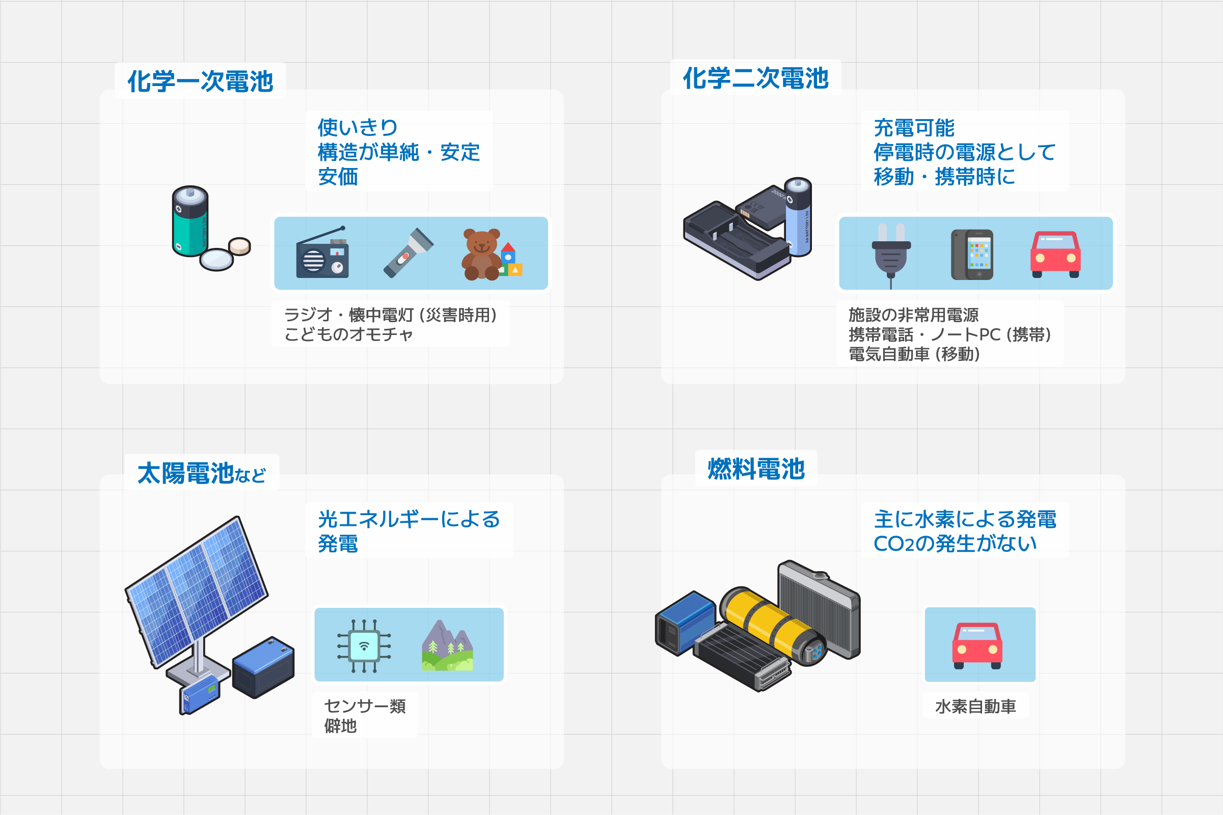 電池を、使い道によって大雑把に分類すると、使い切りの「(化学)一次電池」、電気エネルギーを入れたり出したりできる「二次電池」と、外部から供給される他のエネルギー源を元に電気を生み出す「燃料電池」や「太陽電池」に分けることができます。