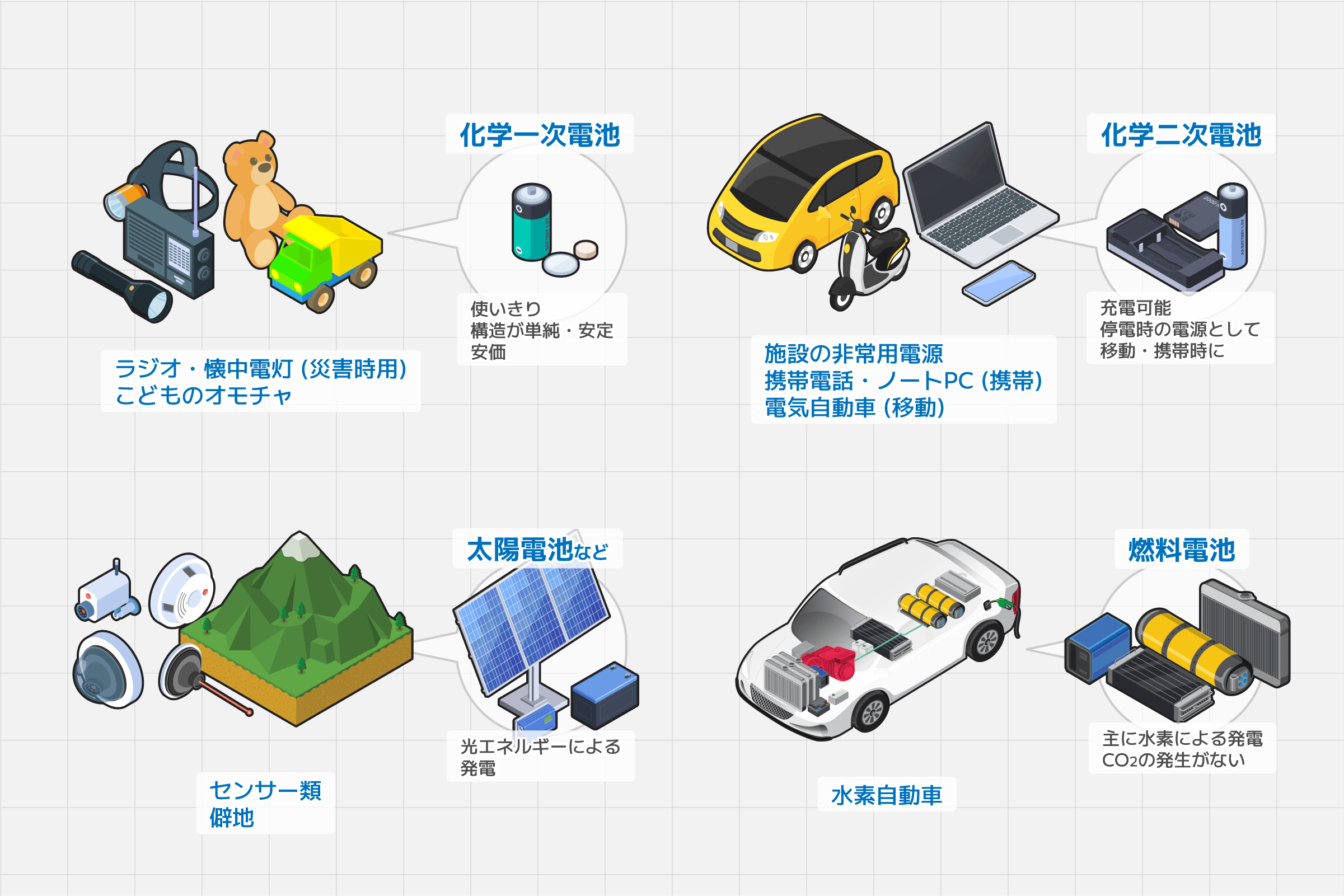 この用途では充放電回数が多く、重量や体積が重要になるため、エネルギー密度の高いリチウムイオン電池などが採用されます。